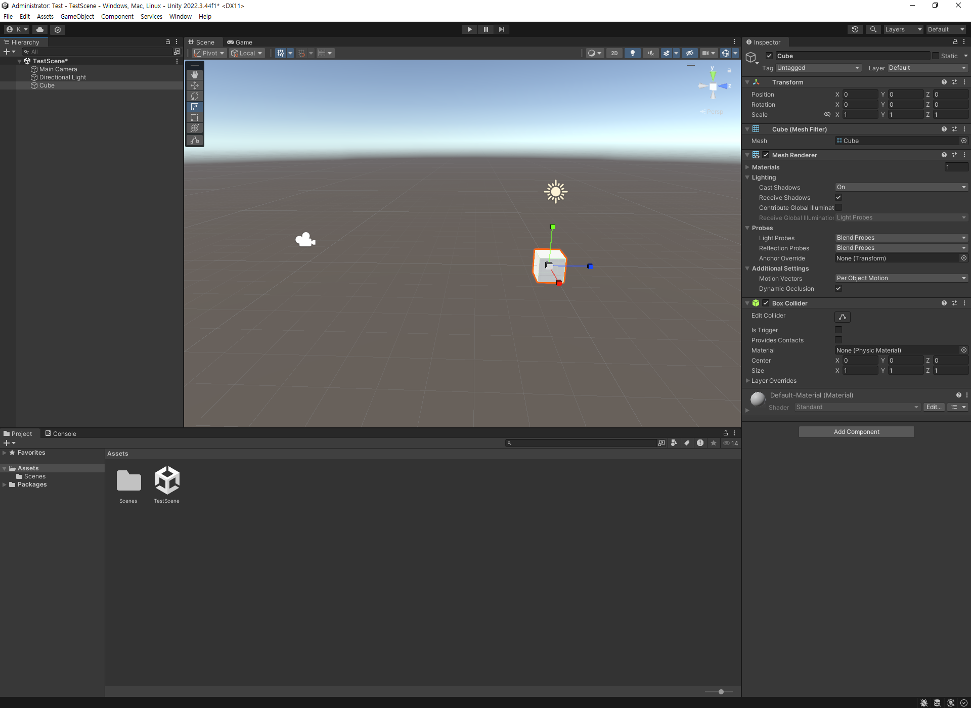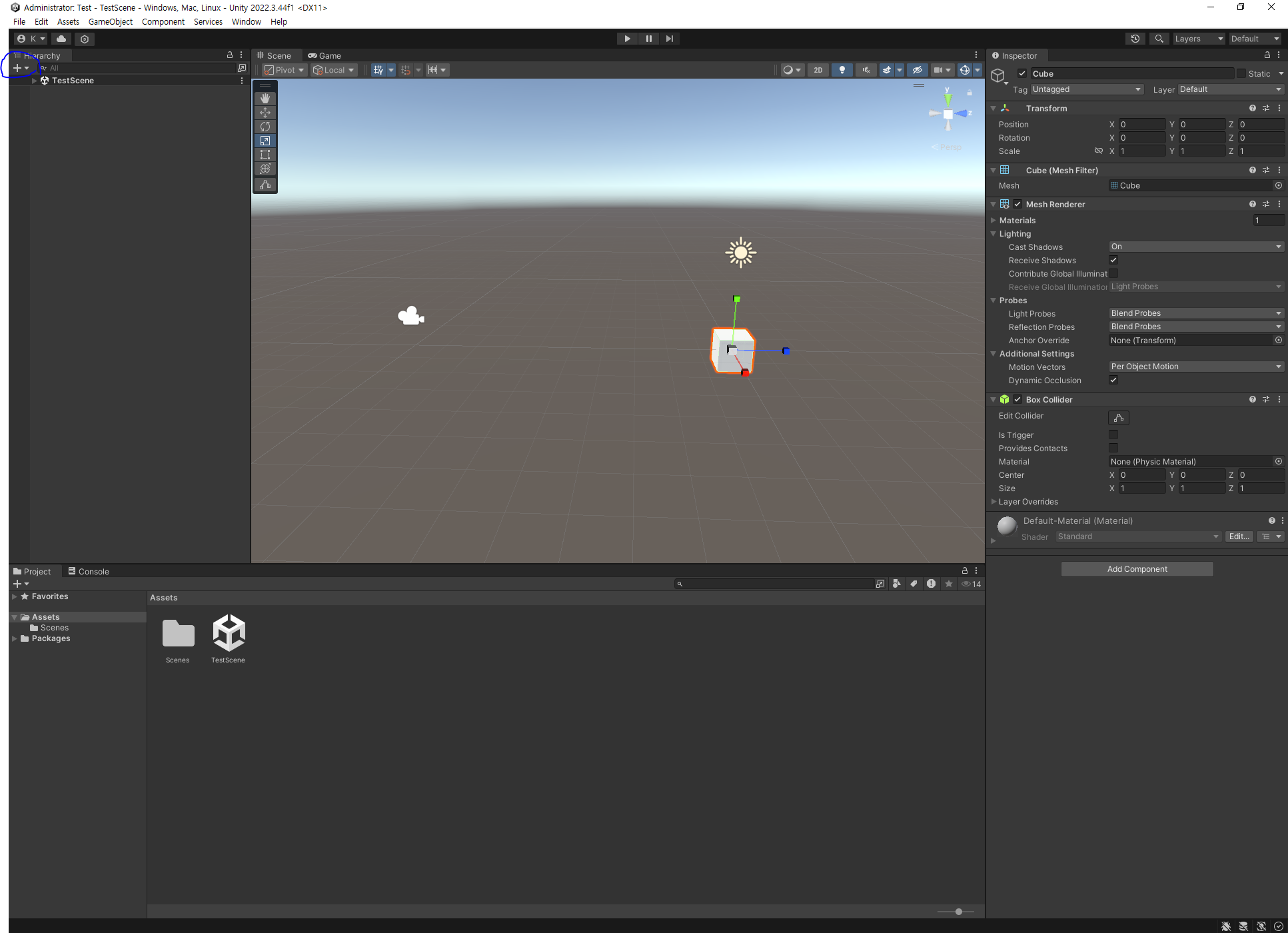 간단하게 정육면체를 추가하는 내용을 학습해봤어요. 말 그대로 정육면체 오브젝트를 Scene 화면에 추가하는 간단한 작업이었어요