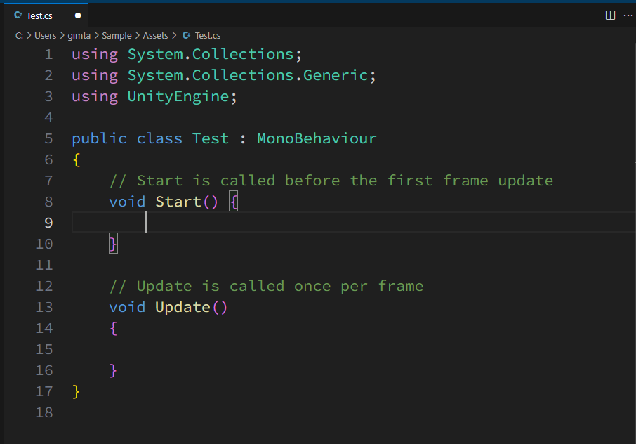 8번 줄에 적인 Start와 14줄에 적힌 Update는 각각 Start메서드와 Update메서드라고 하네요 지금은 아무것도 작성하지 않았지만 블록 안에 처리할 스크립트 코드를 작성할 수 있다고 하네요