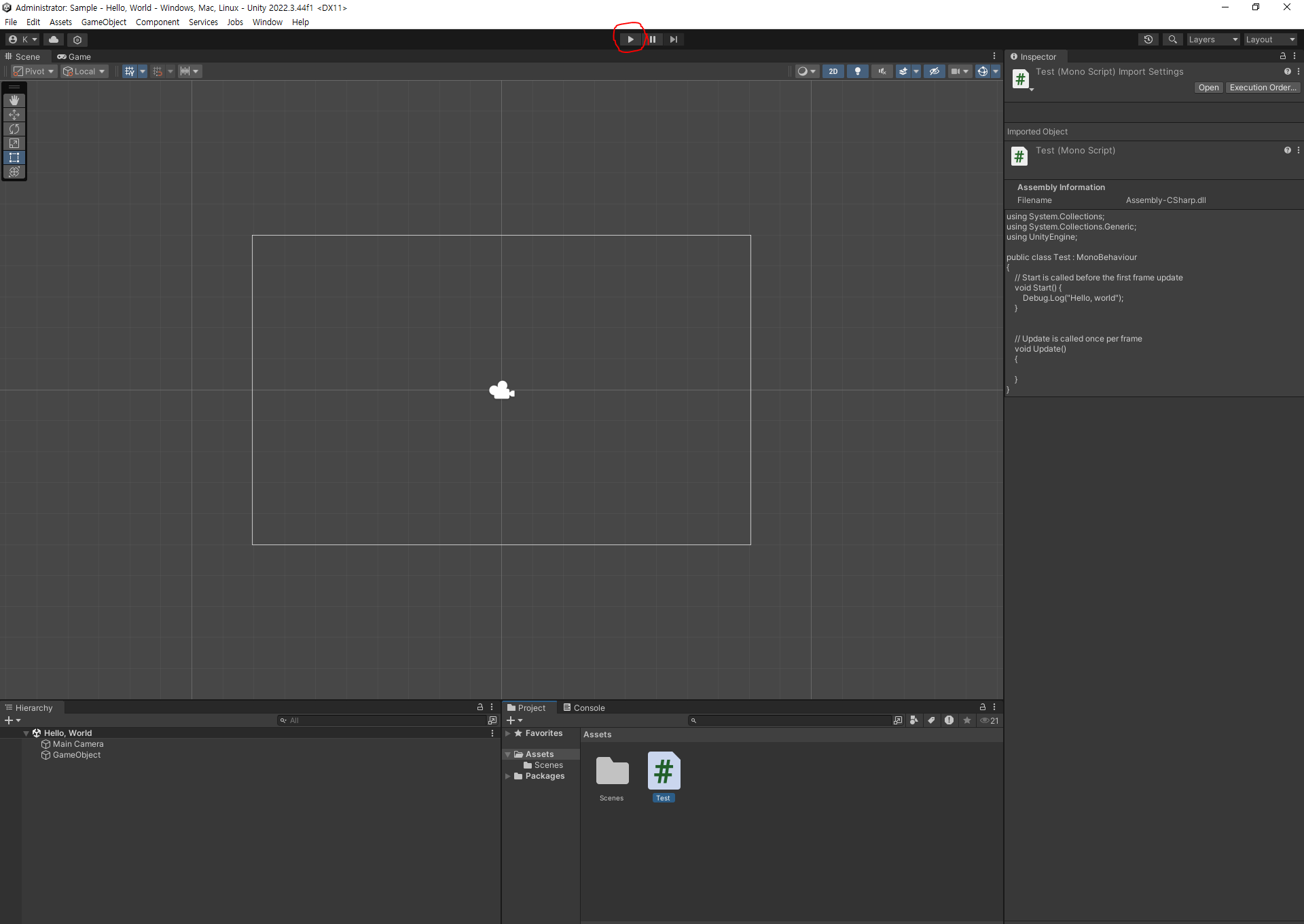 Start 메서드 안에 있는 줄에 Hellow, world를 출력하도록 내용을 추가했습니다. Ctrl + s로 저장한 다음 Unity로 돌아갔습니다
