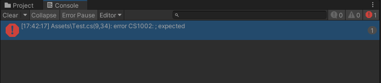 코드를 위와 같이 세미콜론(;)을 빠뜨리고 작성한 뒤 Console창으로 가보니